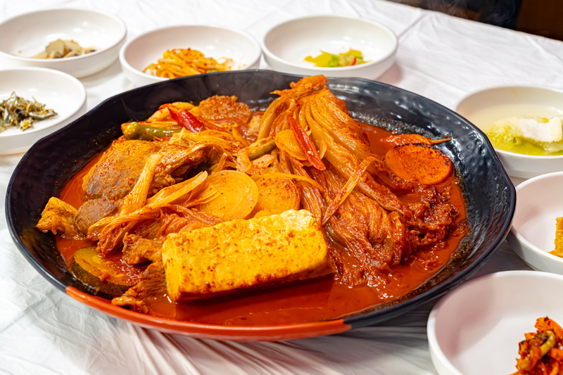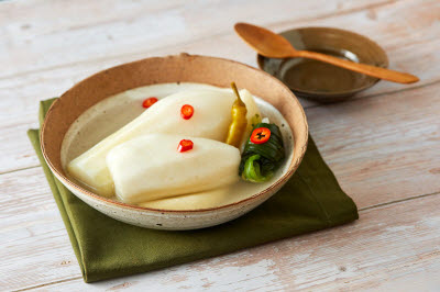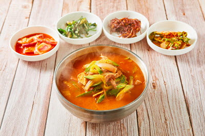 Rice cooked in a stone pot made with agalmatolite is topped with colorful vegetable salads (bean sprouts, spinach, bellflower roots, golden oak mushrooms, water parsley, and crown daisy), stir-fried minced beef, an egg yolk, red chili paste and all mixed together. The hot stone pot bibimbap has a richer flavor and stays hot longer than the original bibimbap. The dish is frequently served with bean sprout soup.