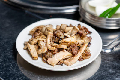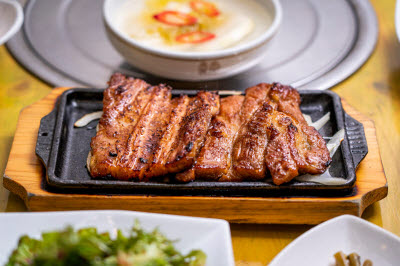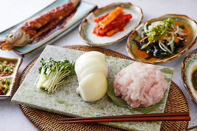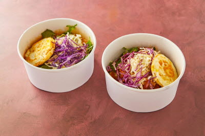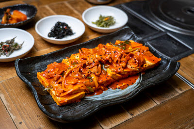 Sea snail, shredded dried pollack, and sliced green onions are seasoned with vinegar and red chili powder. You can enjoy different textures from the chewy sea snail to the shredded dried pollack and fresh green onions. Noodles can be added to the salad.
