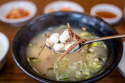 Julienned live squid and vegetables, including cucumbers, onions, carrots, and green peppers, are seasoned with red chili paste with vinegar in a bowl, and water is poured into the bowl. This raw squid served in a cold broth is mainly enjoyed in summer. Visit seaside cities along the east coast of Gangwon State, such as Gangneung, Sokcho, and Samcheok, if you want to enjoy this cold dish.