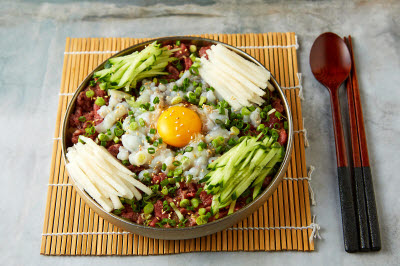 Vegetables or seafood are usually thinly sliced, coated with flour, and then coated with an egg mixture, and finally pan-fried in an oiled pan. The dish is made with beef, codfish fillet, oysters, zucchinis, green peppers, mushrooms, and green onions and several of these pan-fried battered ingredients are served together on a plate. The dish is frequently ordered as a side dish for alcoholic beverages.