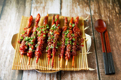 Flour batter is poured onto a hot oiled pan and scallions, squid, clams are layered on top and pan-fried. This pancake goes well with makgeolli (unrefined rice wine). Dip the pancake in soy sauce seasoned with onions or wild chives.
