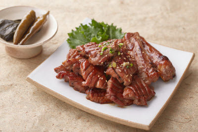 Among beef intestines, tripe, the top portion of the intestine, and daechang, the large intestine, are grilled on the spot. These two parts are often ordered together because of their completely different textures and flavors, complementing each other’s distinct characteristics. The chewy yet stiff tripe is balanced out by the relatively tender and oily daechang.