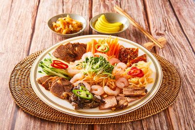 Boiled monkfish slices is a dish of steamed, prepared monkfish. The flesh is moist and tender, and different parts of the fish, including the head, cheeks, skin, and fins, offer varying textures. The steamed fish is served with vegetables such as bean sprouts or water parsley and eaten with red chili paste with vinegar or soy-based sauces. Historically, monkfish was discarded due to its unattractive appearance and difficulty of preparation, but today it is enjoyed as a popular seafood dish in steamed or boiled preparations.