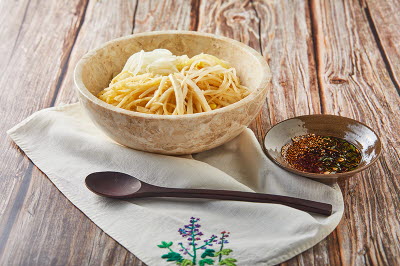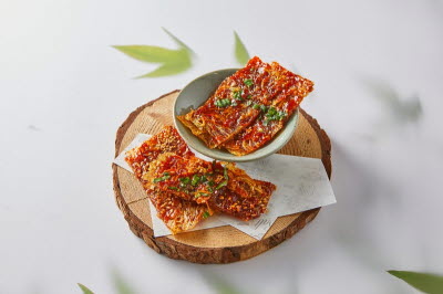 This is a spicy noodle dish featuring fresh sliced raw fish from Jeju Island. Besides sliced raw fish, this dish also includes shredded cabbage, lettuce, perilla leaves, and cucumber. The sweet and spicy sauce seems to hold together the combination of chewy noodles, thick and fresh raw fish, and fresh vegetables.