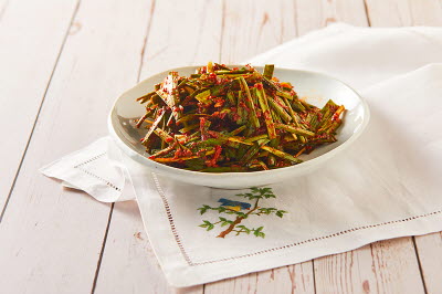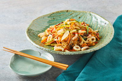 This fish dish was often featured in royal banquets. It is a dish where white fish fillets like croaker, flatfish, and sea bream are coated with starch, then parboiled. Parboiled fillets are plated with other parboiled seafood such as hard clam, abalone, and conch. Another way to serve this dish featured long strips of boiled meat, egg garnish, and red chili pepper, wrapped in parboiled water parsley. Generally, fish was parboiled rather than served raw in the royal court, as ferrying seafood from afar limited its freshness, making it difficult to eat raw except during winter. The dish is served with mustard sauce or red chili paste with vinegar, just like vegetables in spring.