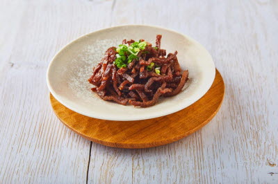 This dish is made by tossing parboiled squid with red chili paste with vinegar, noodles, and vegetables. Squid is peeled, parboiled, and sliced thinly, along with water parsley, cucumber, and carrots. Sauce from red chili paste with vinegar, sugar, starch syrup, and sesame oil is made. Noodles are then boiled, rinsed in cold water, drained, and tossed with the prepared sauce. Once done, squid and vegetables are added, lightly tossed, plated, and garnished with sesame oil and ground sesame seed. The combination of chewy squid, crunchy cucumber, and water parsley goes perfectly with the fresh and light noodles.