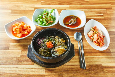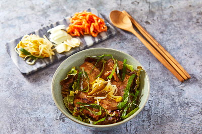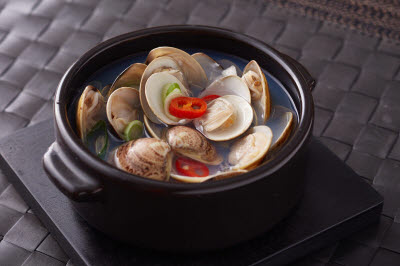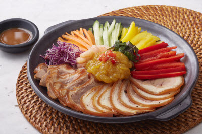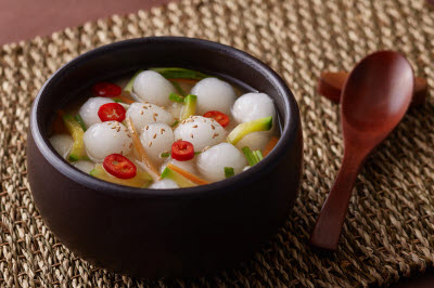 This summer dish features a rectangular mandu filled with summer squash, cucumbers, golden oak mushrooms, and beef, boiled, then put into a cold broth. This variant uses thin slices of summer squash, salted, then drained, and mixed with finely minced beef and golden oak mushrooms as the filling. Mandu skin is made by rolling out a thin dough and shaping it into a rectangular form before boiling the mandu in hot water.