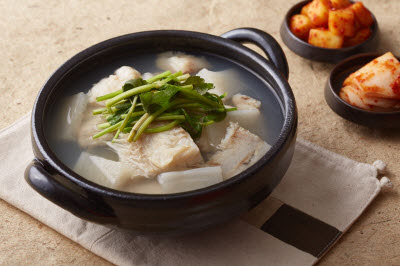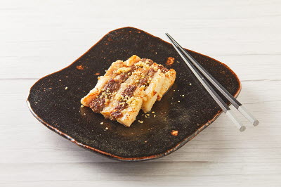 This is a folk dish often eaten in Busan alongside fishcake skewers at snack stands around the city. It is a rice cake stick, skewered as one would with fish cake, simmered in a fishcake soup. Rice cake sticks used for this dish are thin and long, made from steamed nonglutinous rice powder. When simmered in warm broth, they soften and become tender, yet chewy. It soaks up the fishcake soup and brims with light yet savory flavor. The skewers are dipped in soy sauce to taste, but some places use red chili paste with vinegar. However, true aficionados like their skewers without any extra sauce.