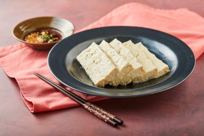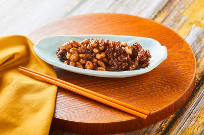 This salad adds fresh vegetables to silken bean curd, a soft and digestible food. After removing excess moisture from silken bean curd, it is cut to size and topped with leafy vegetables, nuts, and dressing. The dressing is made from whole sesame seeds, citrus preserves, soy sauce, sugar, vinegar, and black pepper. It goes well with the rich taste of silken bean curd. This dish excels not only in taste but also in nutrients. In addition, it is also quite filling, thus helping in weight loss, and goes well with other dishes.
