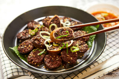 Hwangpomuk is a folk dish of Jeonbuk State, particularly serving as an essential element of the toppings used in Jeonju bibimbap and providing a splash of yellow on the bowl. Also known as yellow cheongpomuk (mung bean jelly), it is made by mixing mung bean starch with gardenia seed water, which colors it yellow. Hull the mung beans and grind them finely with water, sieve the mixture, and let the starch settle. Add five cups of gardenia seed water to a cup of starch, and bring to a boil while stirring. Once the starch starts to thicken, salt as needed and let cool in a bowl. Slice flatly, then serve with sauce. These jellies are fluffy and springy, seemingly melting way easily in one’s mouth.