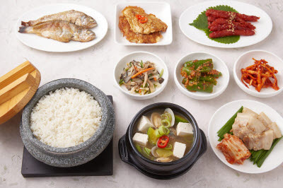 Ganghoe refers to a parboiled vegetable roll made with the likes of water parsley and green onions. It is traditionally eaten around Buddha’s Birthday, as the best way to enjoy the vegetable at the height of its season. Boiled beef slices, yellow and white egg garnish, and red chili pepper are all sliced to similar sizes, while water parsley is parboiled in salt water and wrung to remove moisture. Boiled beef slices and vegetables are layered, and the whole thing is rolled in water parsley. The rolls are accompanied by red chili paste with vinegar. A similar dish made with small green onions is called “pa ganghoe.”