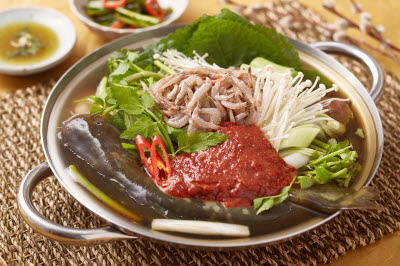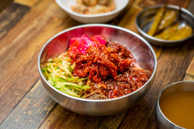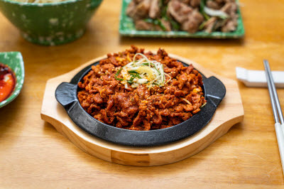 It is a stew boiled with seasoned pork with potatoes, onions, and other vegetables. Boil potatoes, onions, green onions, extra spicy chili peppers, and ham with a combination of soybean paste and red pepper paste. The key point of making potato and pork stew is to put less water than a regular stew. The well-cooked soft potatoes and the spicy and savory seasoning go fantastically well together. If you put it on rice and mix it, a bowl of rice will disappear in no time.