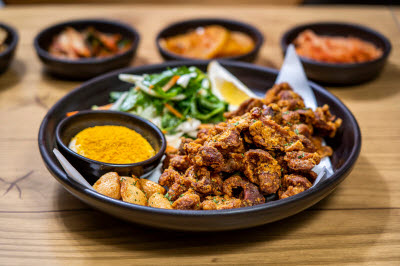 “Geonjeong” is the word used to refer to dried fish in the area around Sinan in Jeollanam-do. When the cold wind started to blow in Sinan, people would begin drying the fish to store them over winter. The traditional method for making “geonjeong” is to gut fish like croaker, sea bass, and rockfish, then salt the fish and wash them in seawater. Next, skewer the fish in wooden skewers, and then hang them out to dry for about a month in the sea wind. Steamed dried croaker is an exquisite dish used for memorial rites. The fish is soaked slightly in the water rinsing the rice, spiced with green onions, garlic, onion, and extra spicy chili pepper, and then steamed.