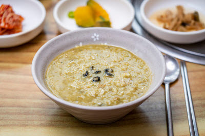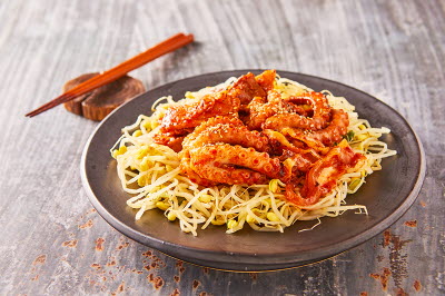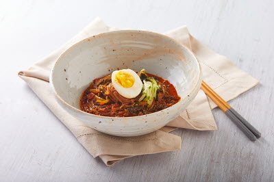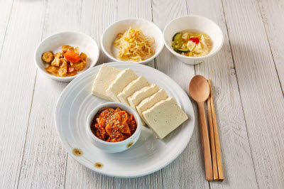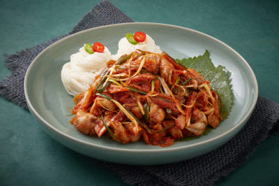 This folk dish from Yecheon, Gyeongsangbuk-do, is a hot pot made with pork, kimchi, and buckwheat or acorn jelly. It is also called “dwaeji muk jeongol,” “taepyeongchae,” “taepyeongcho,” and “muk duruchigi.” Stir-fried pork with acorn jelly was originally a dish served only during the winter. It was enjoyed either with steamed rice or with alcoholic beverages. The dish brings a harmony of textures in tender jelly, crunchy kimchi, and chewy pork, all swimming in a spicy and rich soup. The jelly must be placed into the soup when the latter is boiling so that the former maintains its chewy and tender texture without disintegrating.